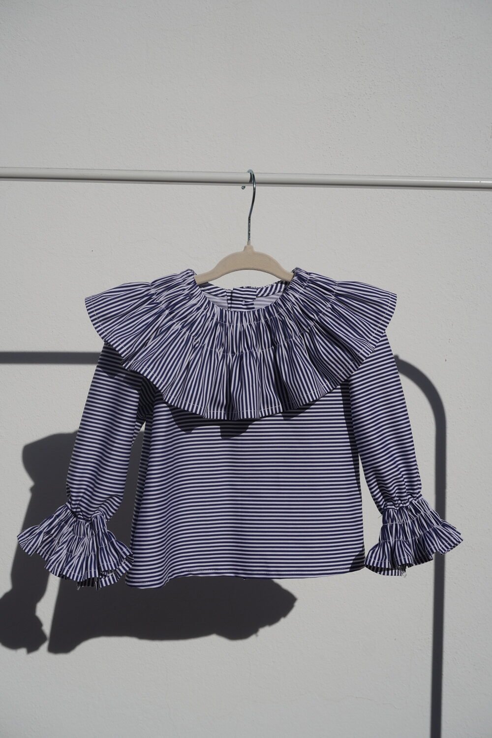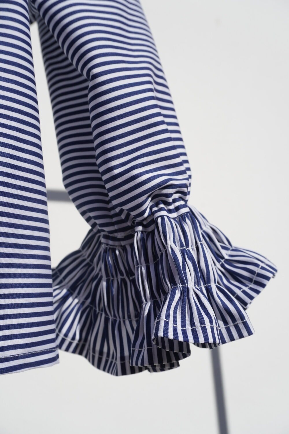 Cuello y puños embellecido con volante fruncido y pespunteado .