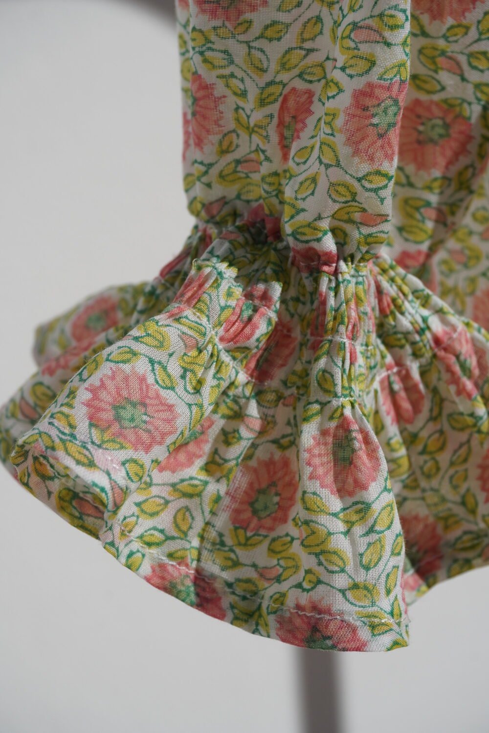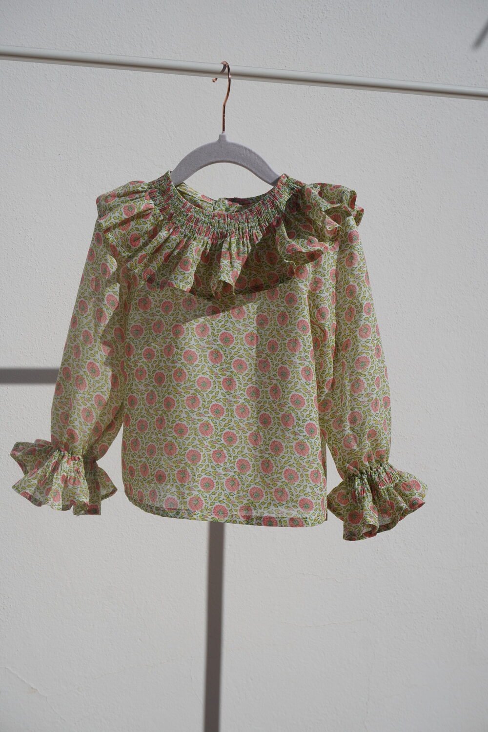 Camisa confeccionada en algodón de manga larga fruncida en el extremo con elástico , cierre en la espalda con botones de nácar .