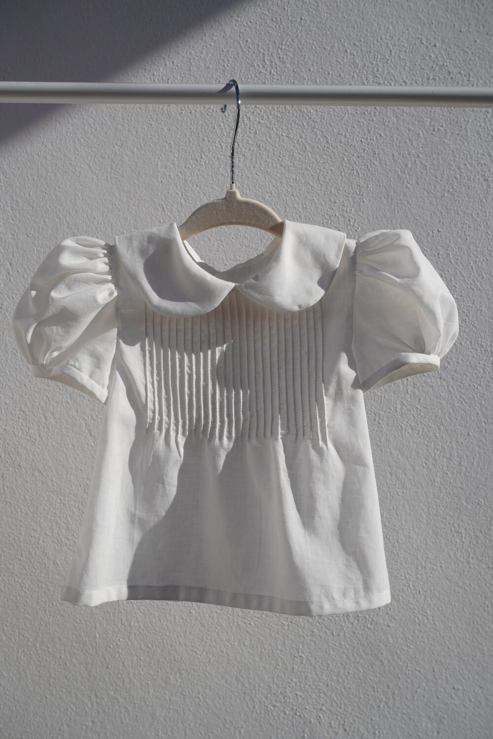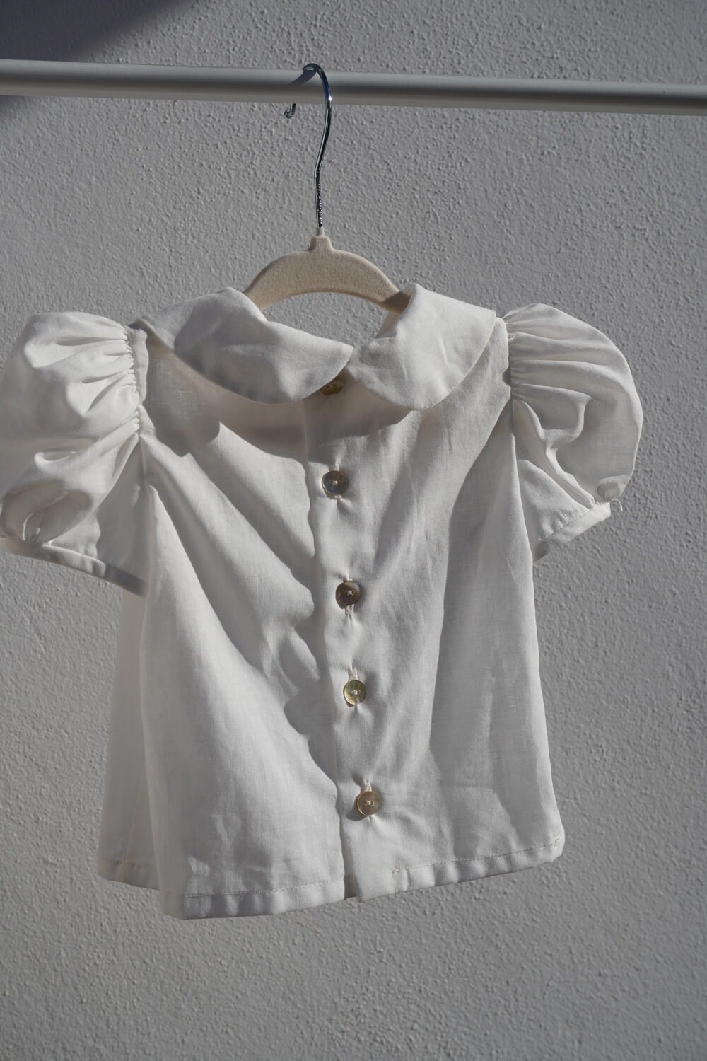 Camisa confeccionada en batista de algodón de manga corta, cierre en la espalda con botones de nácar .