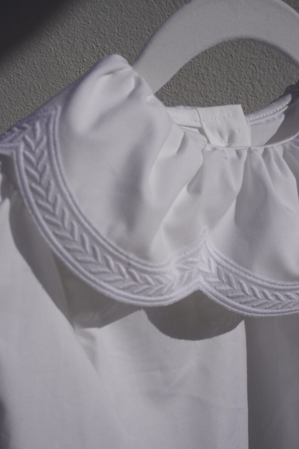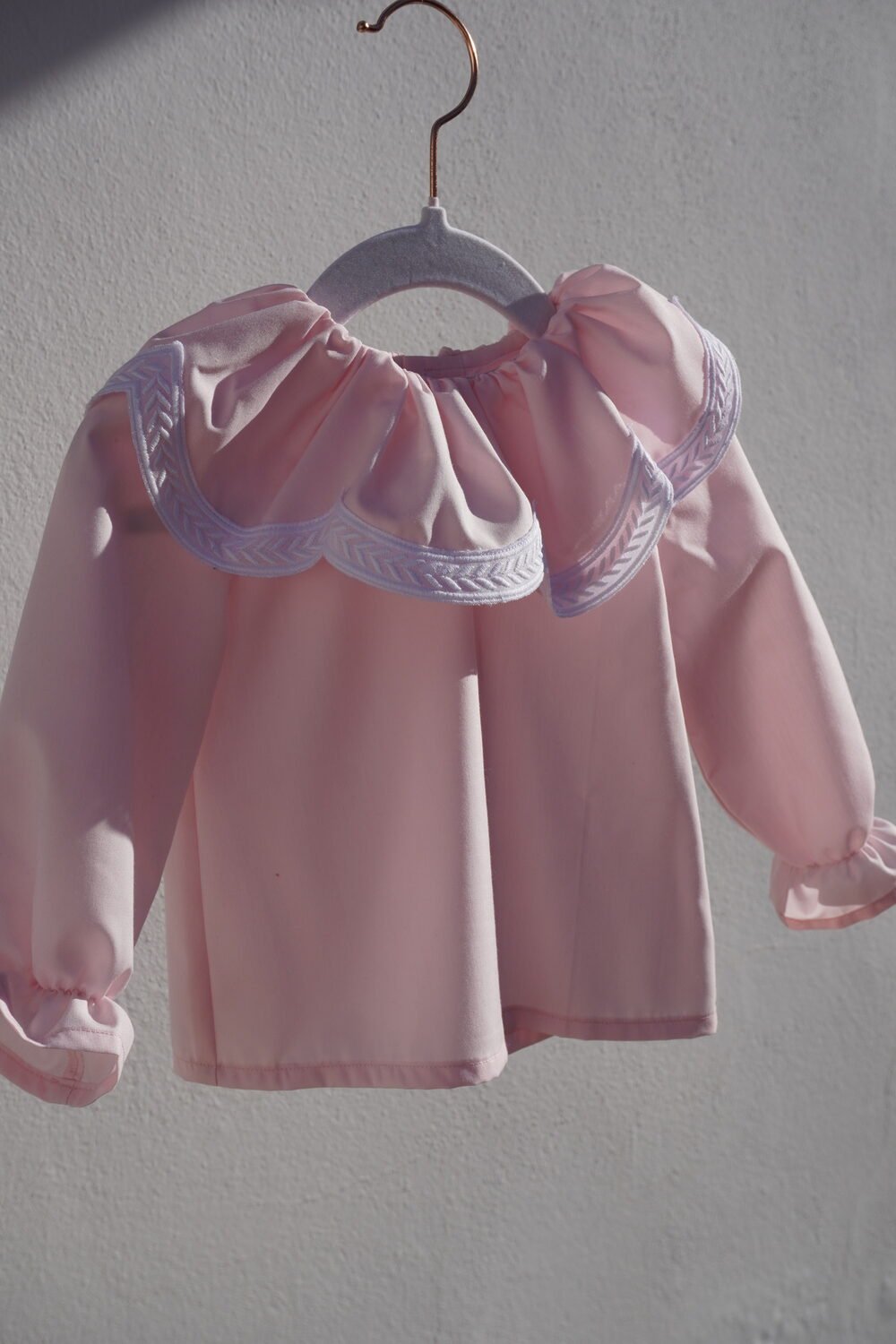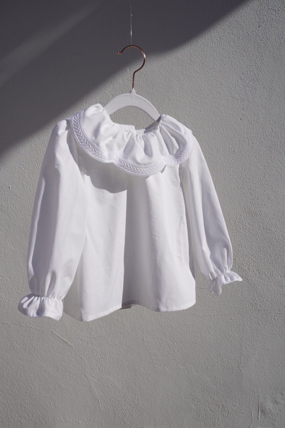 Camisa de algodón con cuello fruncido terminado en tira bordada blanca en arcos , manga larga con goma en los puños .