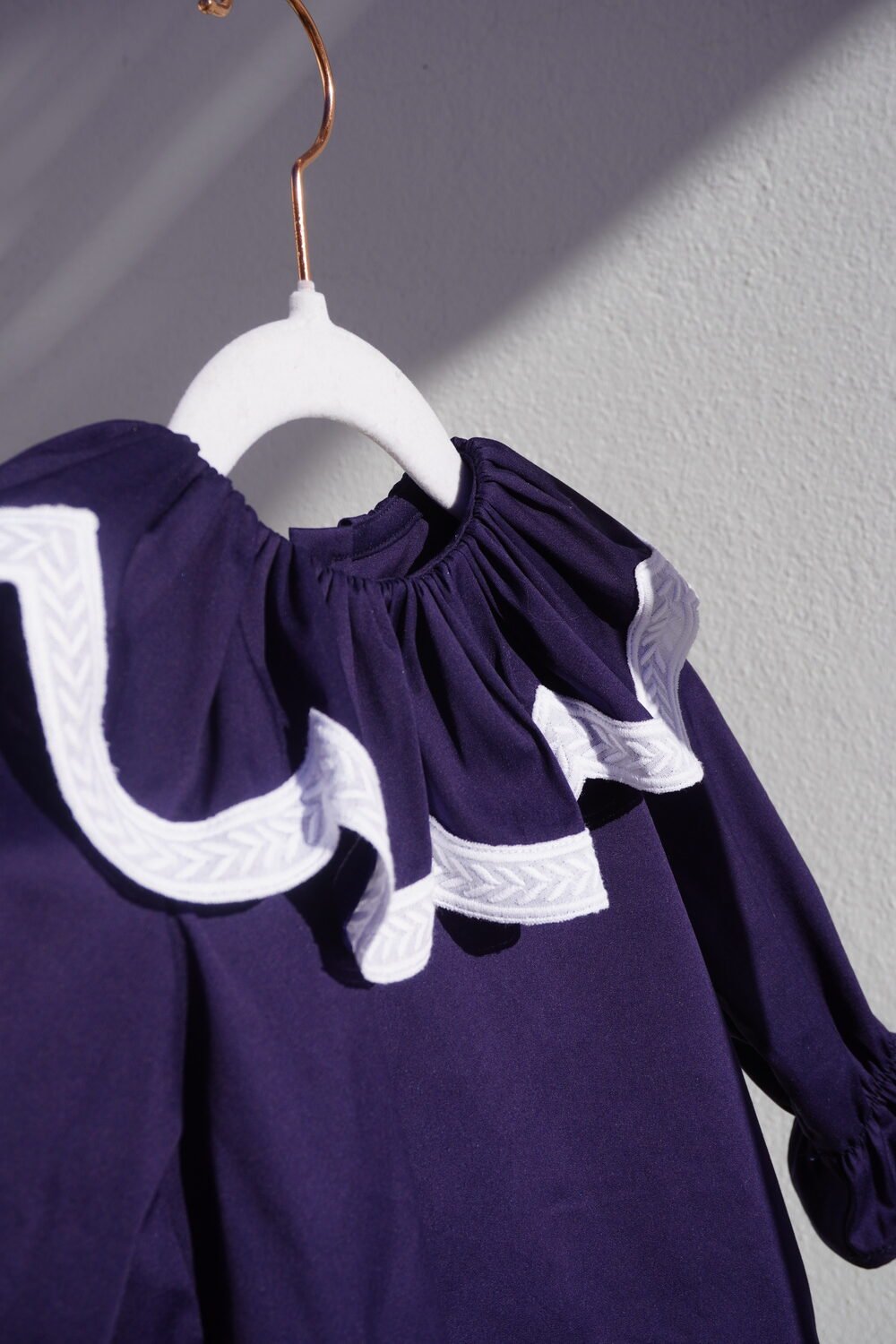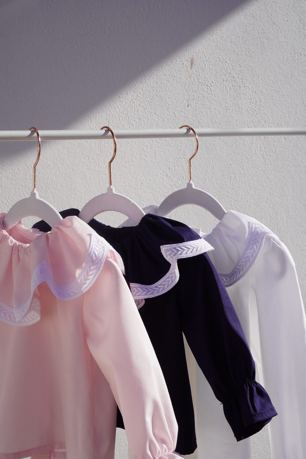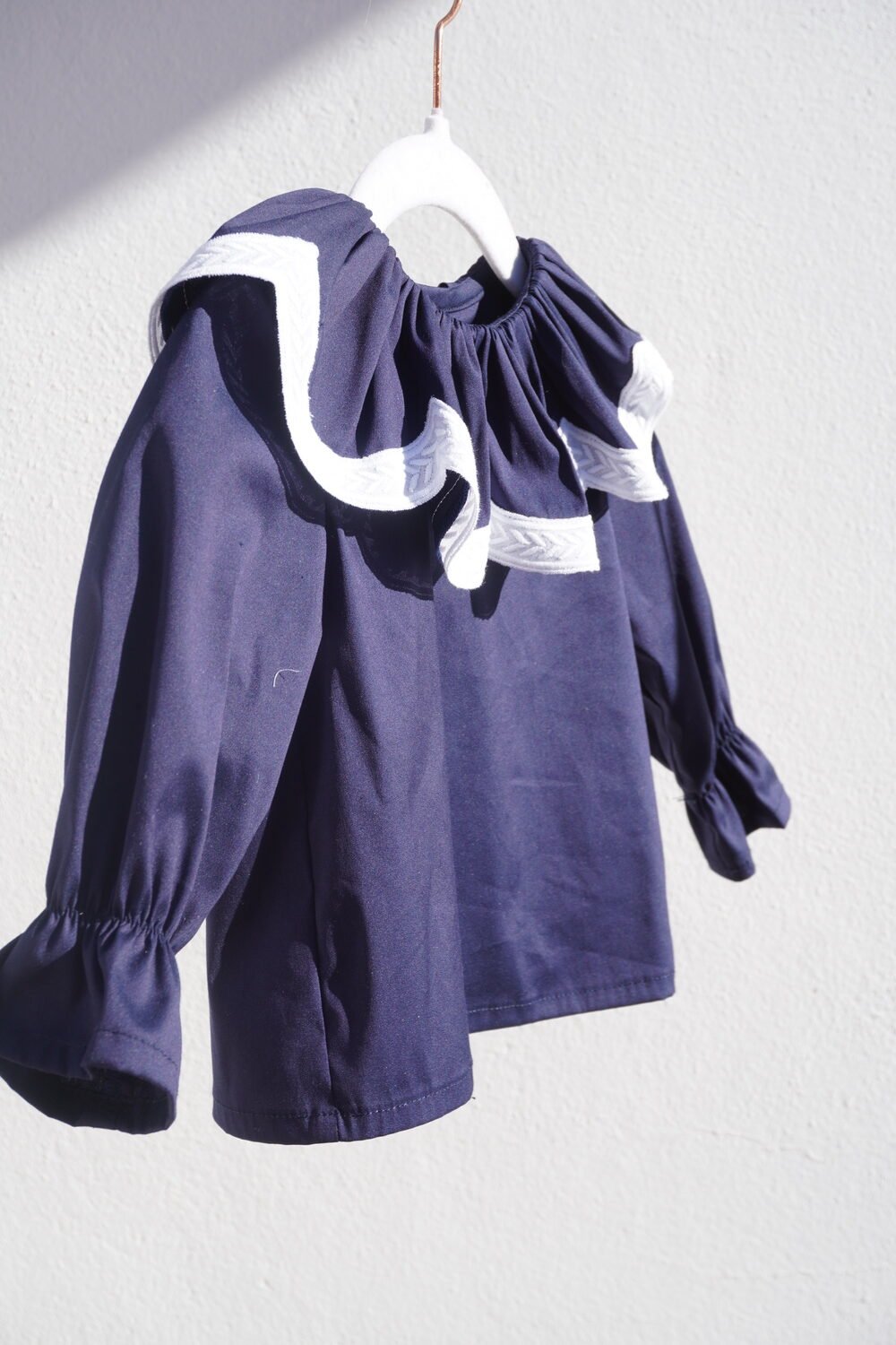 Camisa de algodón con cuello fruncido terminado en tira bordada blanca en arcos , manga larga con goma en los puños .
