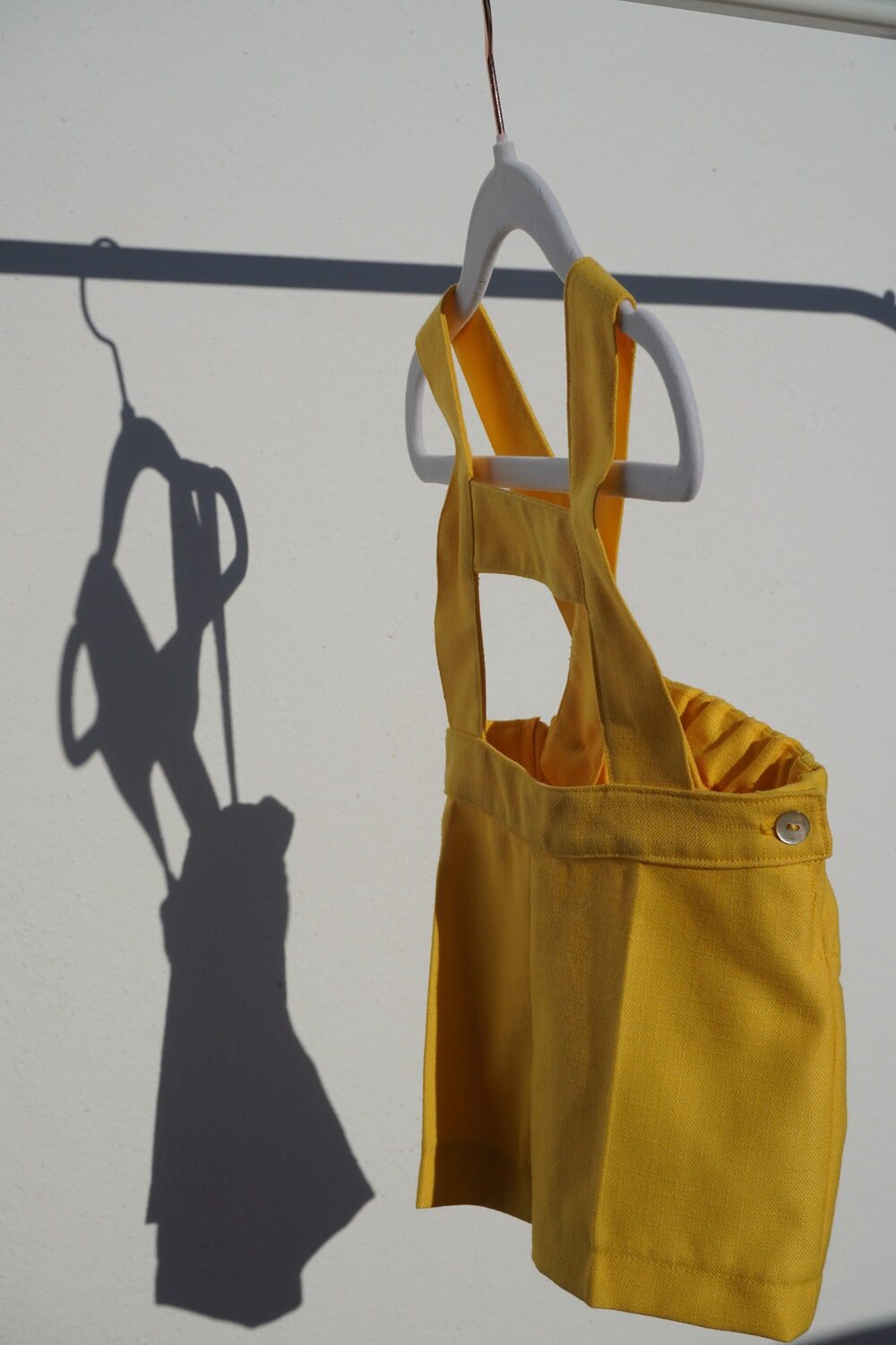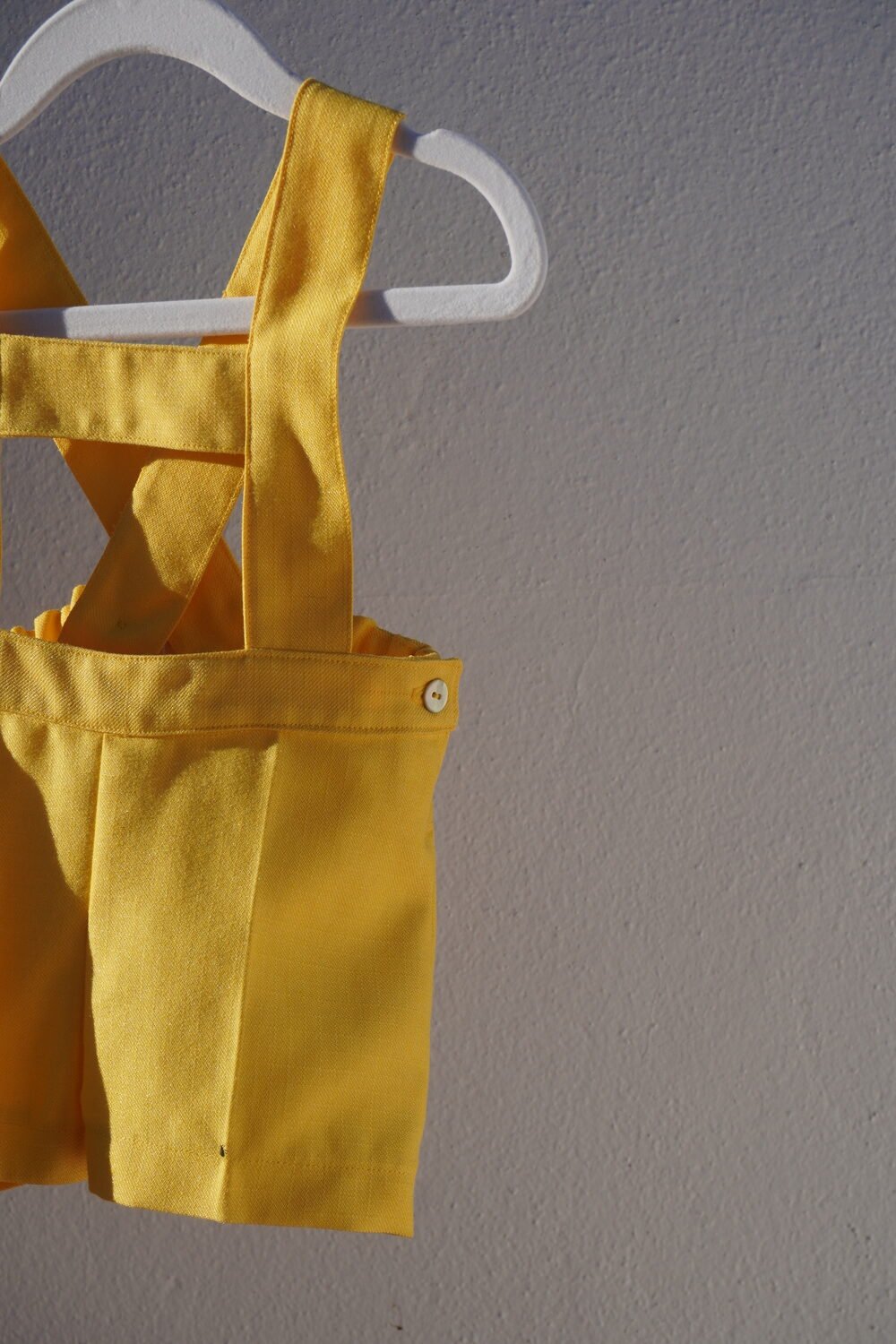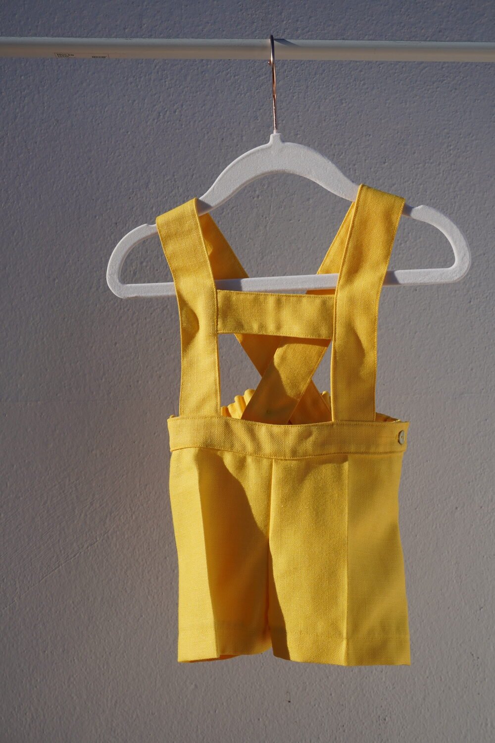 Pantalón corto con cinturilla abotonada en los laterales y espalda ajustable con elástico . Planchado con raya . Tirantes ajustables con botón de nácar .
