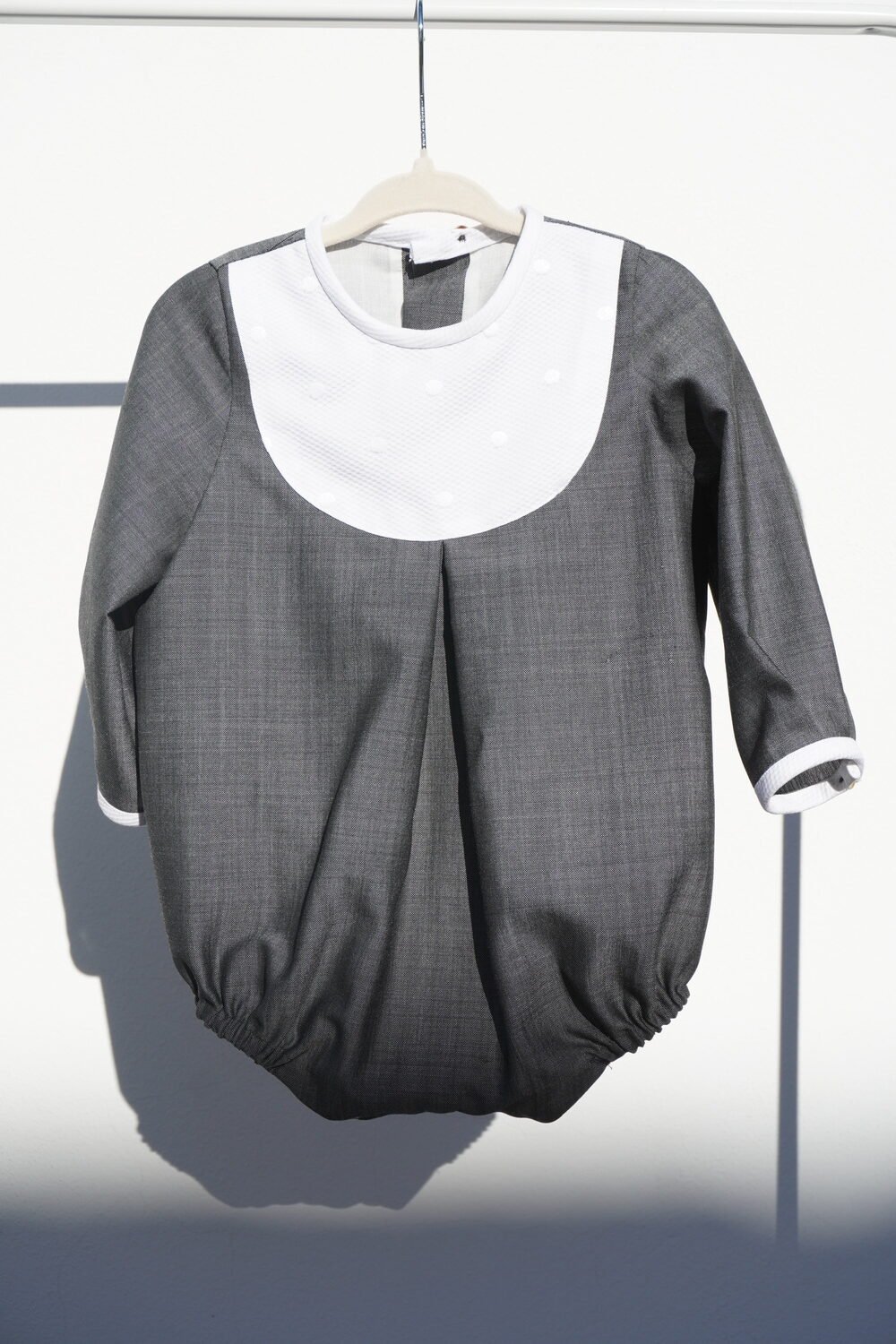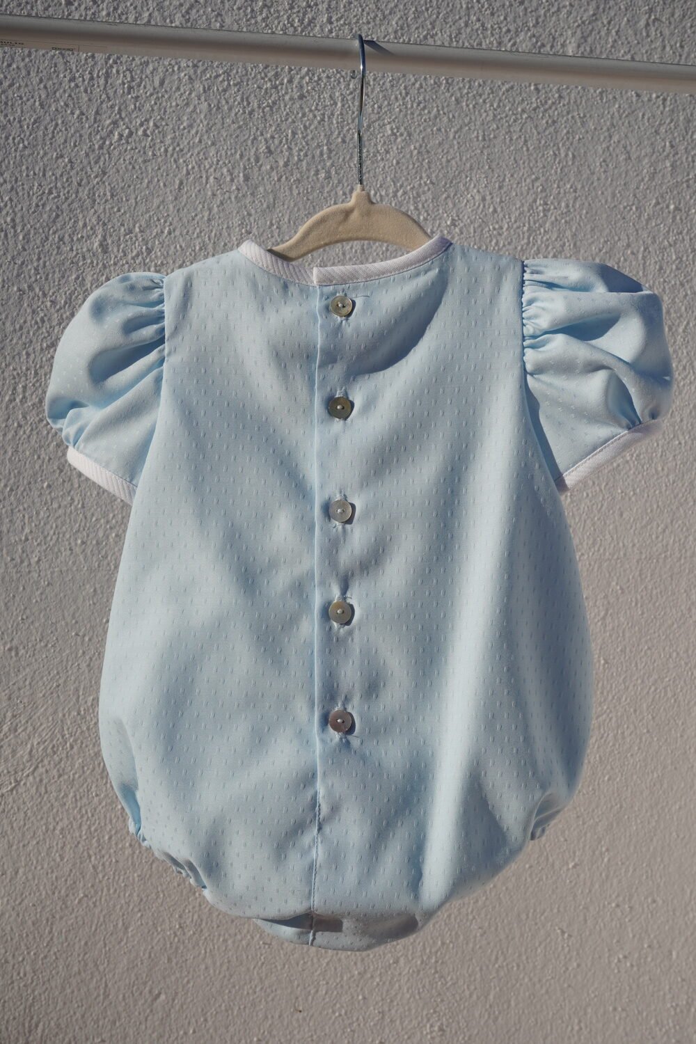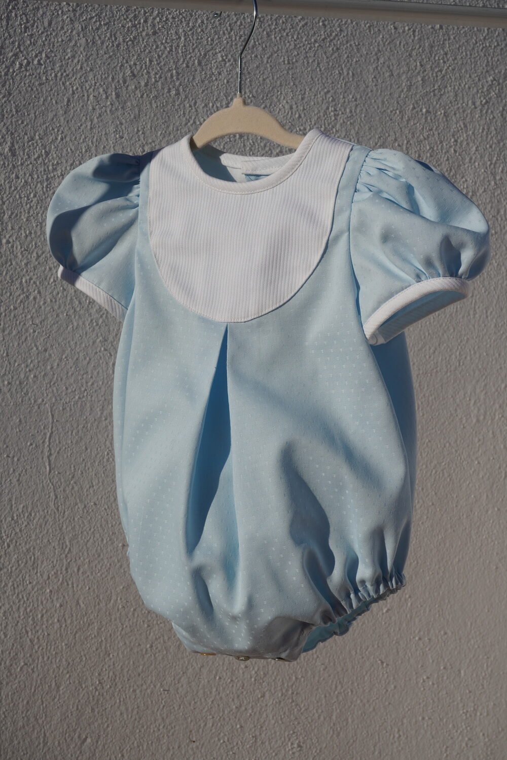Pelele con pecherín de piqué blanco y tabla en el delantero . Abotonado en la espalda y el bajo con botones de nácar . Piernas ajustables con elástico .