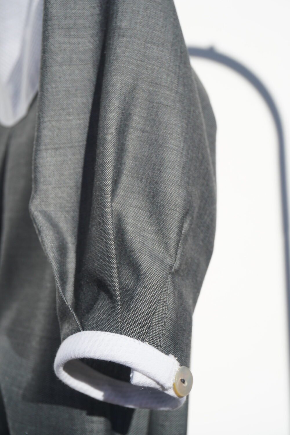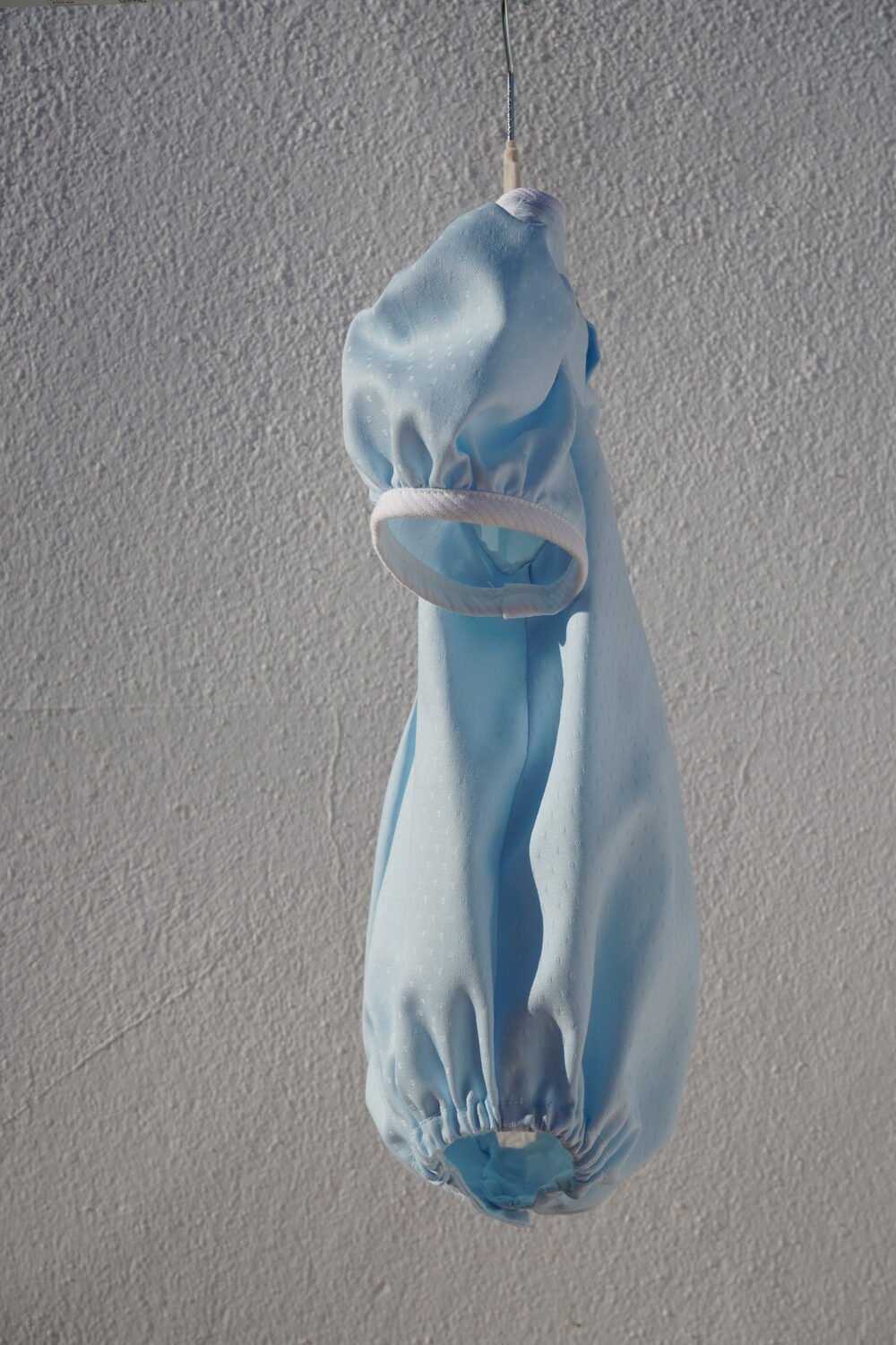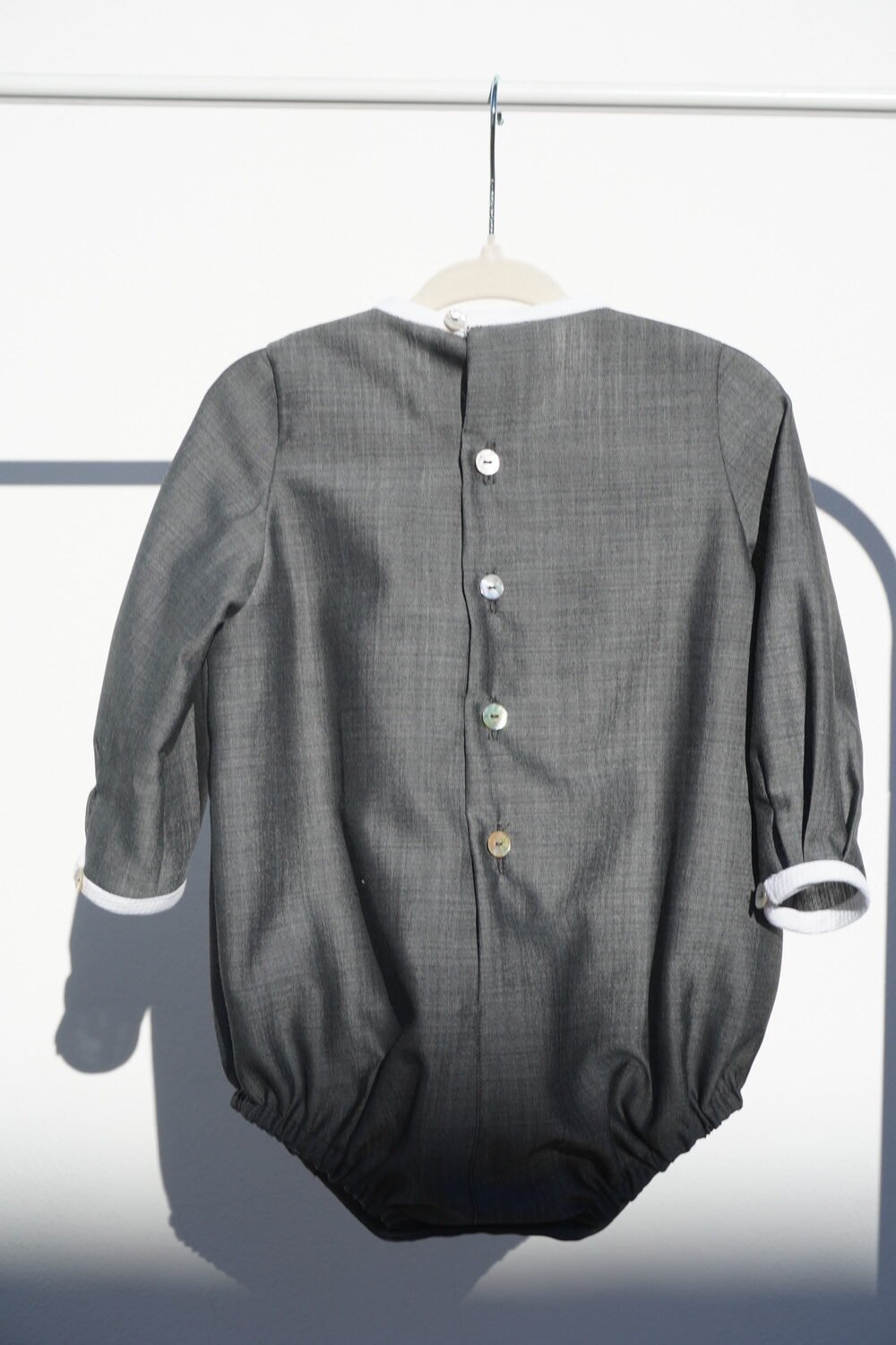 Pelele con pecherín de piqué blanco y tabla en el delantero . Abotonado en la espalda y el bajo con botones de nácar . Piernas ajustables con elástico .