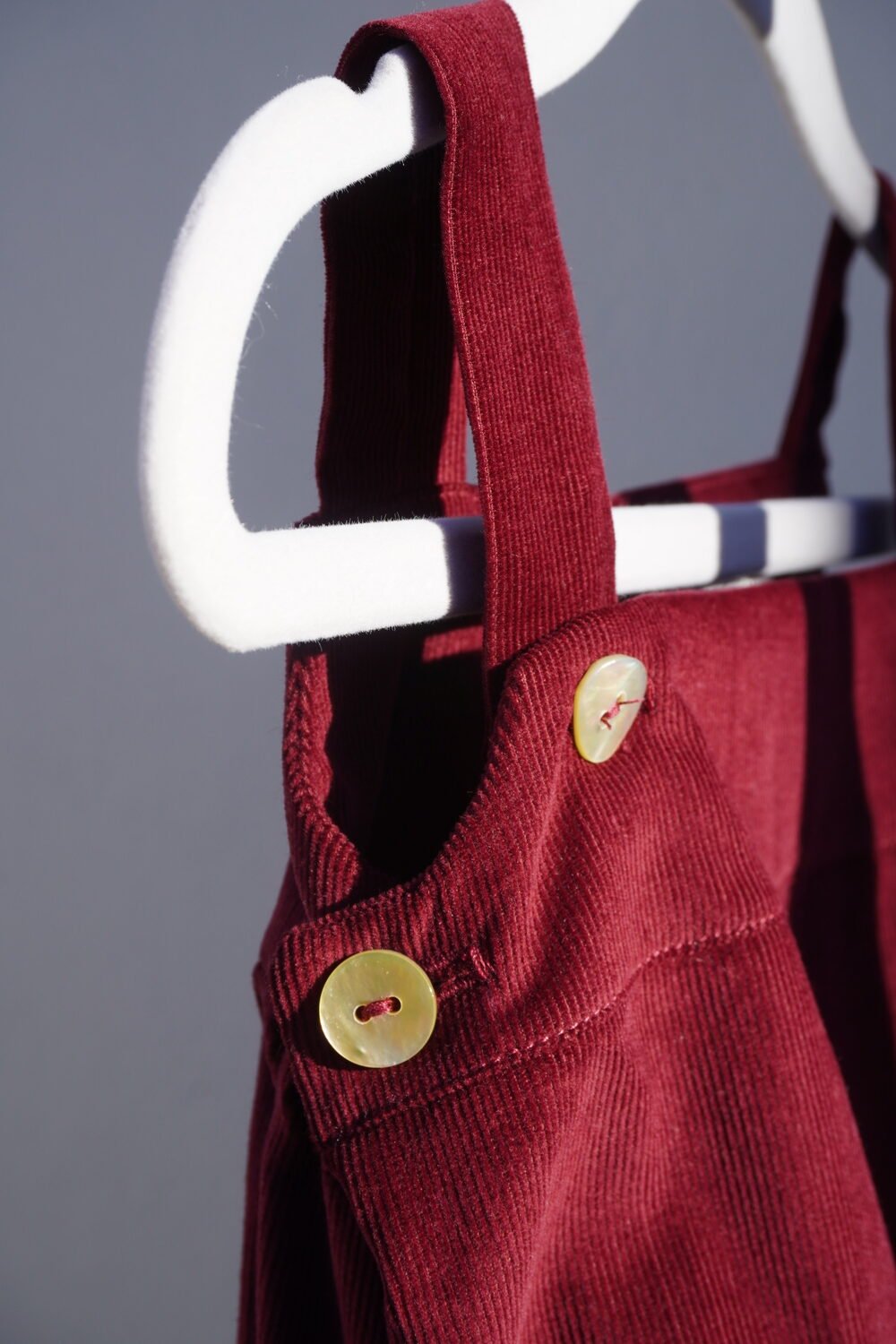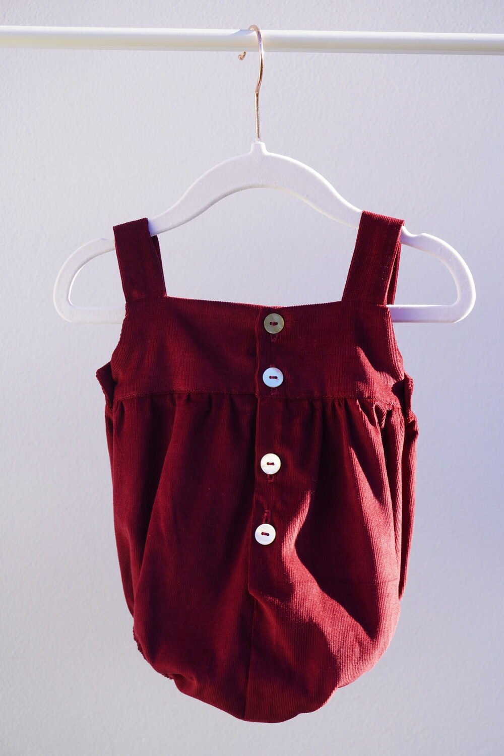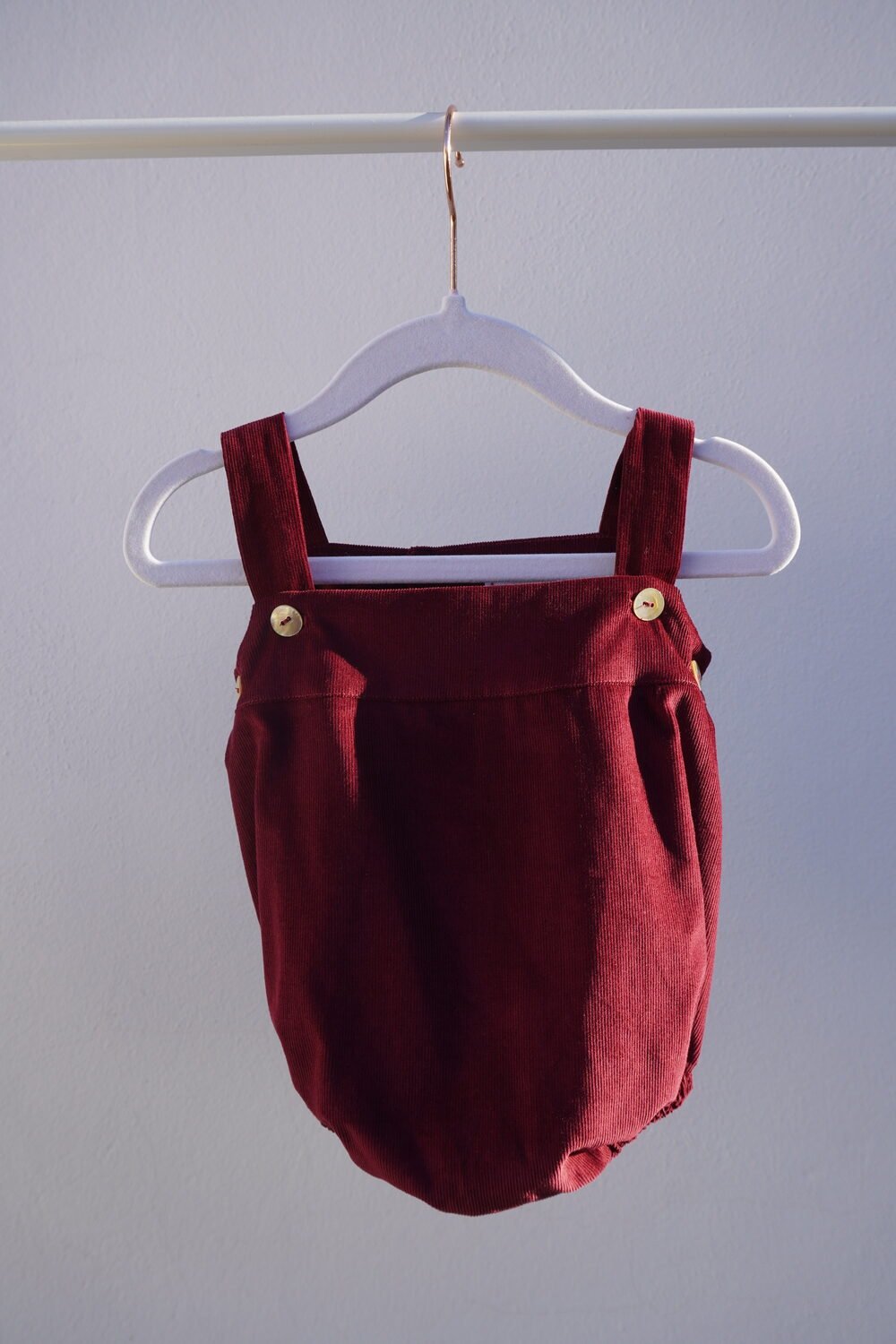 Pelele de pana con tirantes y laterales ajustables mediante botones de nácar . Piernas con elástico y cierre en el bajo mediante botones de nácar .