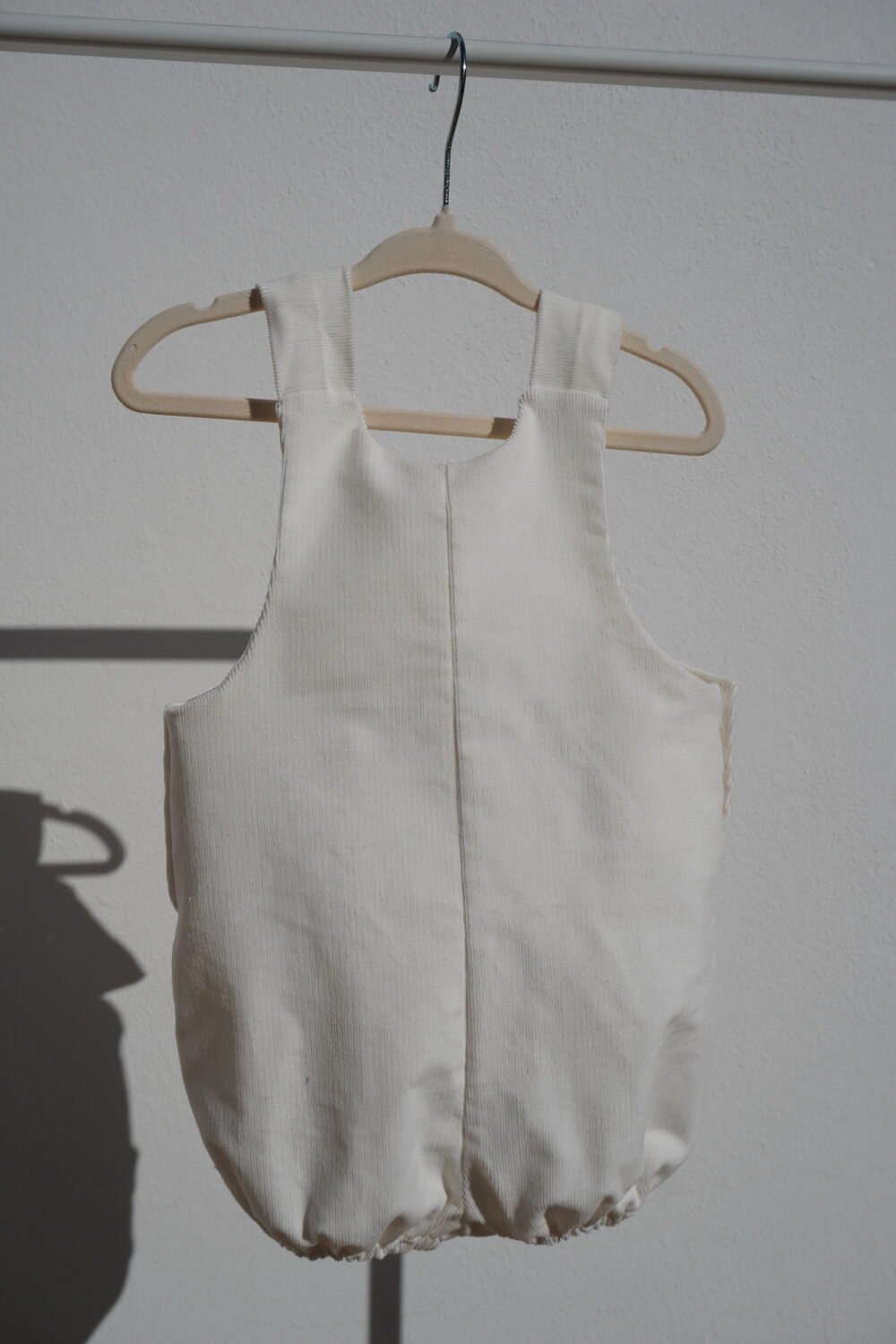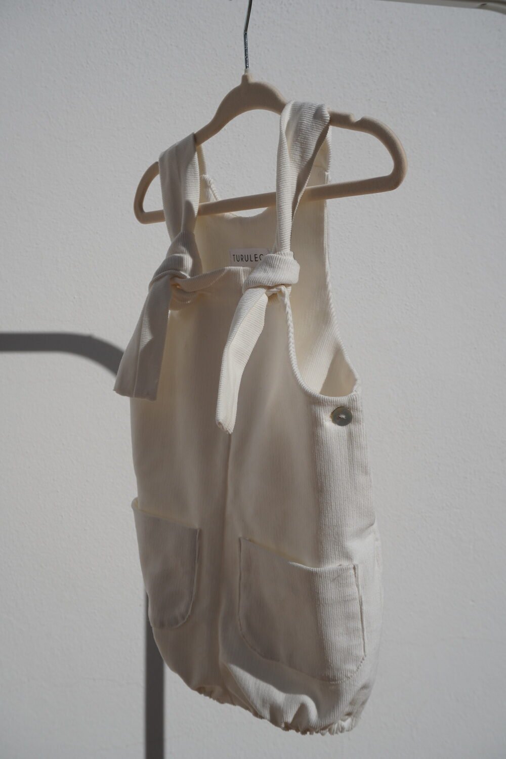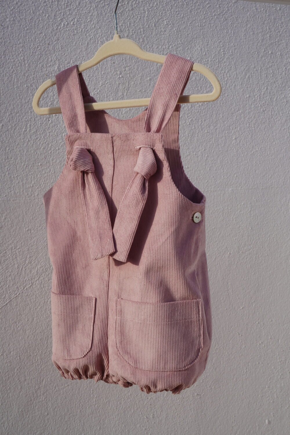 Peto de pana con bolsillos parches en el frontal , tirantas ajustables mediante nudo . Cierre en laterales con botón de nácar . Piernas fruncidas con elástico .