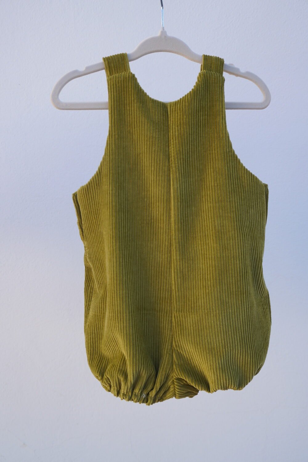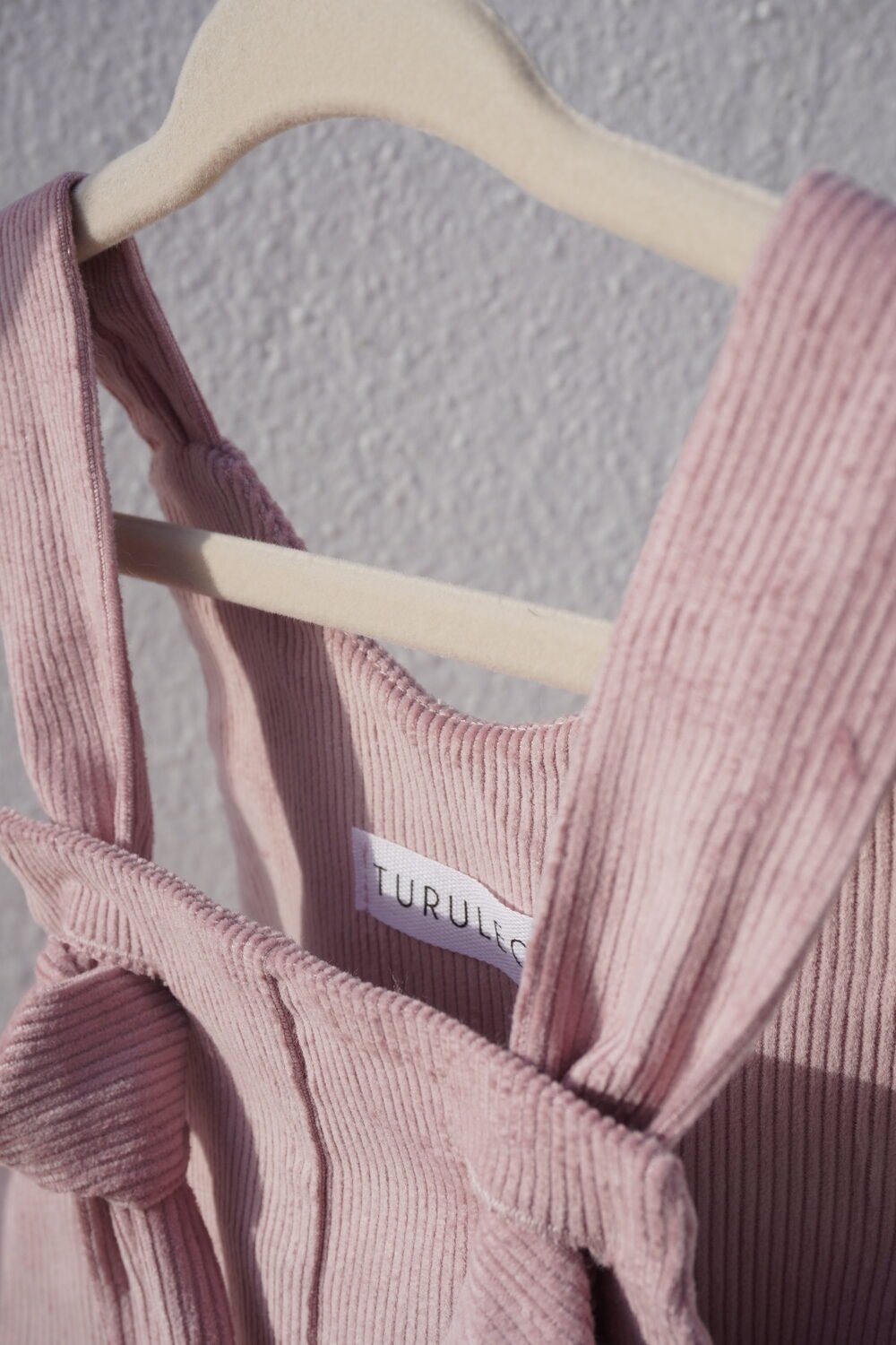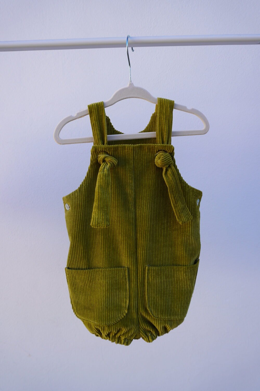 Peto de pana con bolsillos parches en el frontal , tirantas ajustables mediante nudo . Cierre en laterales con botón de nácar . Piernas fruncidas con elástico .