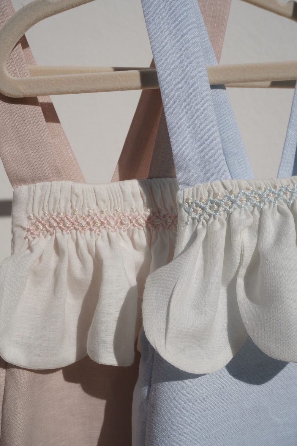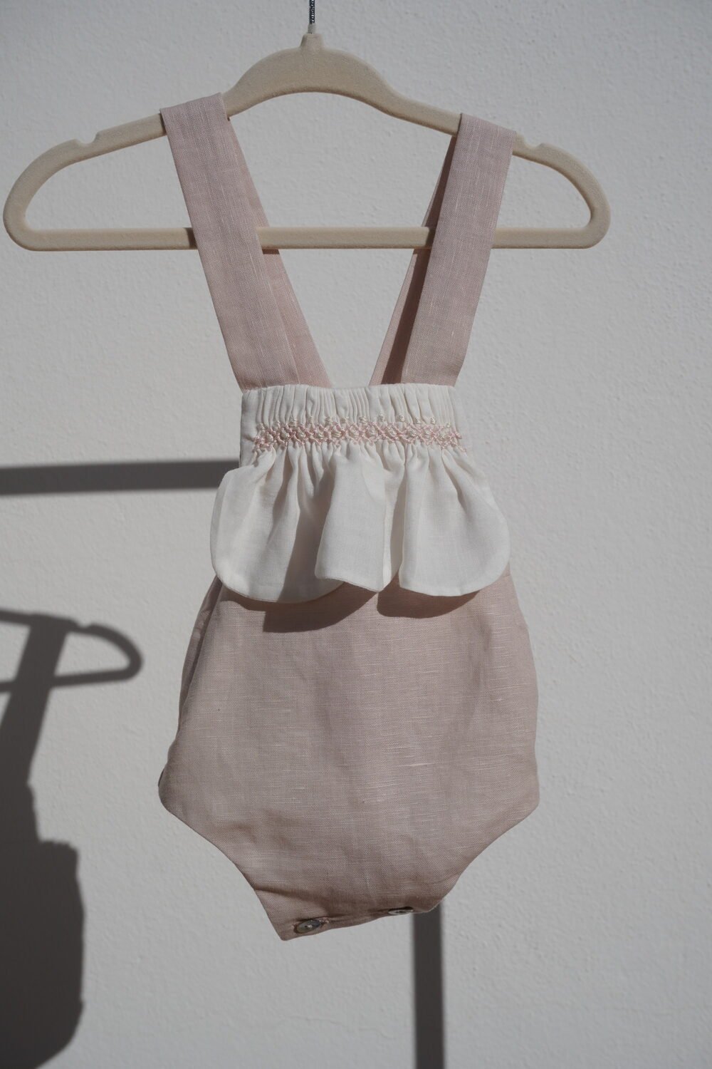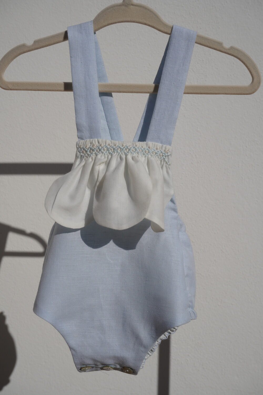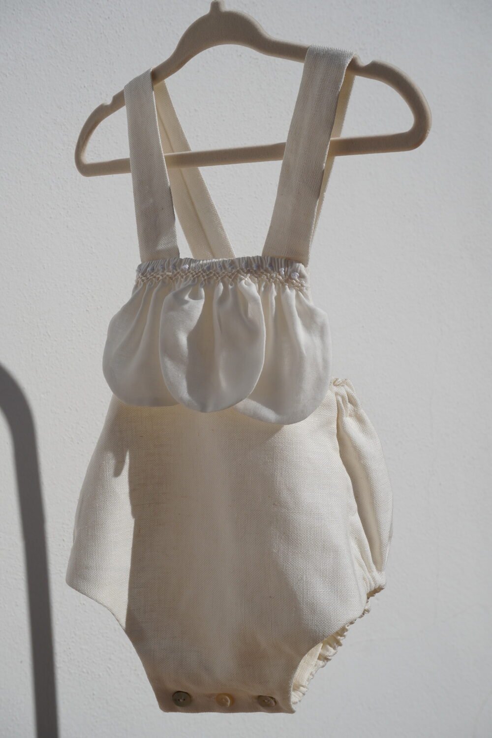 Tirantes ajustables en la espalda mediante botón de nácar , gomas en cintura y piernas para ajustar la prenda . Cierre en el bajo mediante botones de nácar .