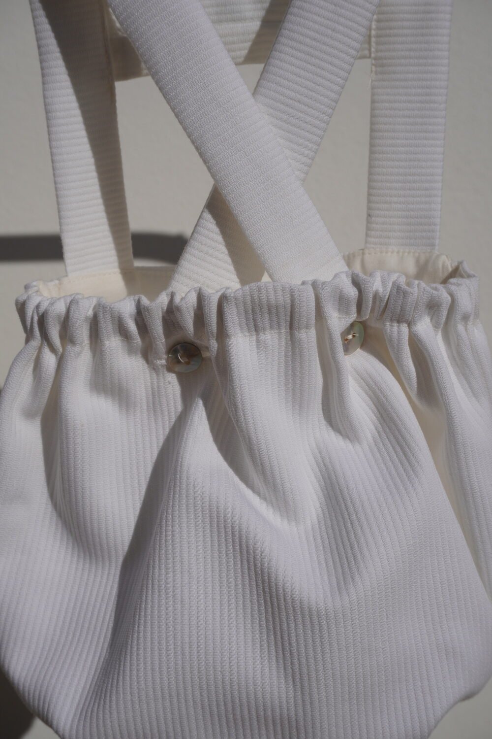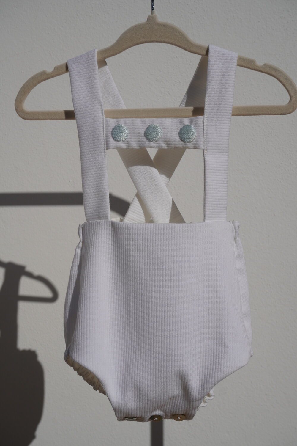 Ranita de pique con peto bordado ,tirantas ajustables en la espalda con botón de nácar . Cintura y piernas ajustables con elástico y bajo con cierre mediante botones de nácar .