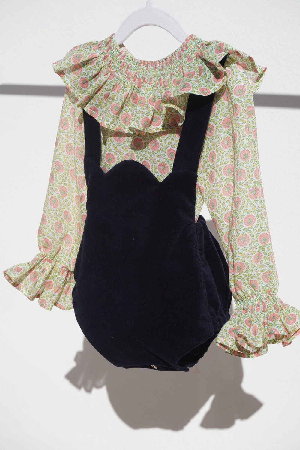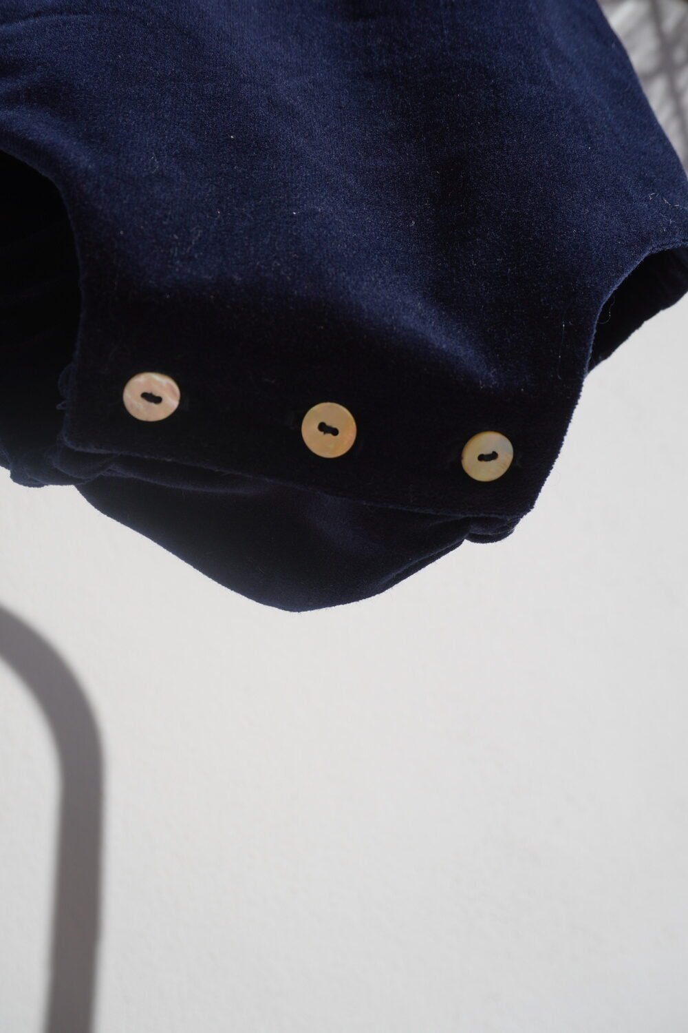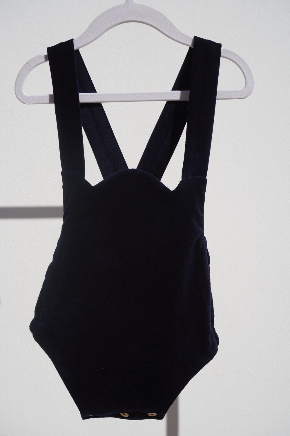 Ranita de pana lisa con peto en forma de arcos , tirantas ajustables mediante botón . Cierre en el bajo mediante botones de nácar .