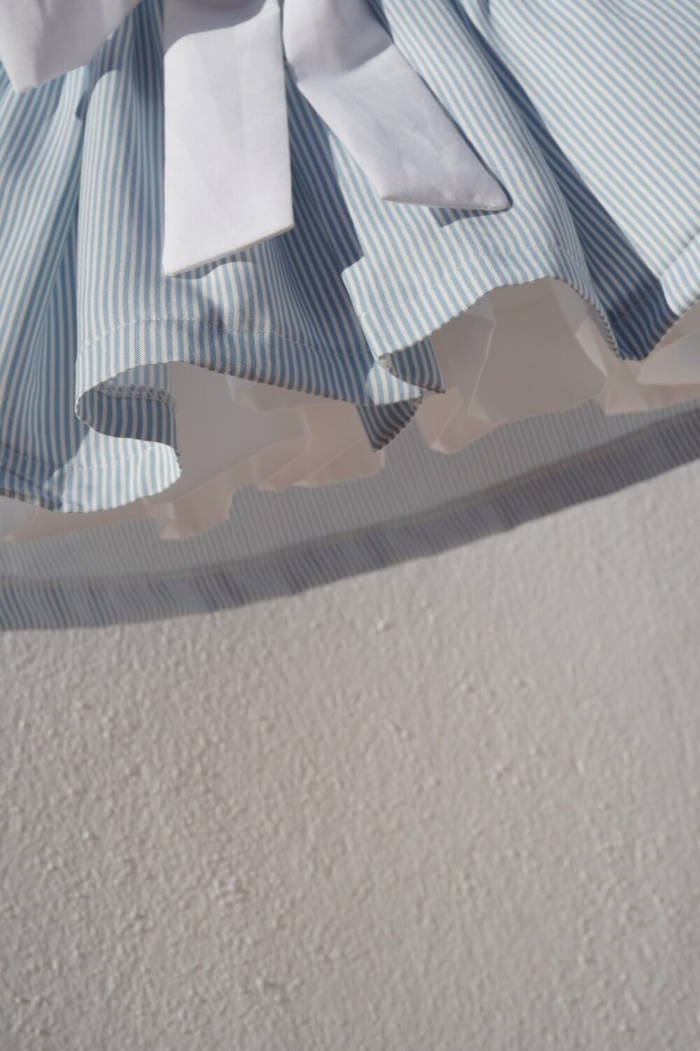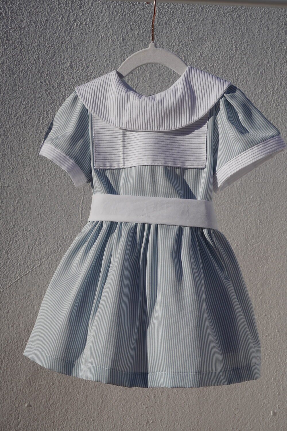 Vestido de manga corta con pecherín de piqué blanco , falda fruncida y cierre en espalda con botones de nácar . Cintura decorada con lazada atada en la espalda .