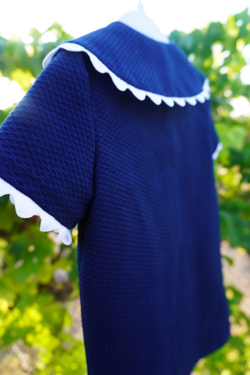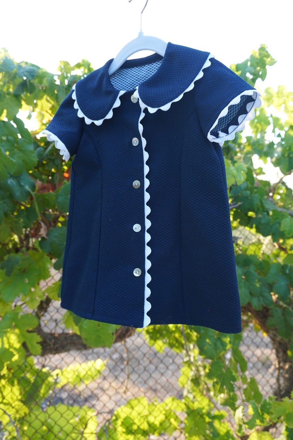 Vestido de piqué entallado con cuello bebé y manga corta . Cierre del vestido en el delantero mediante botones de nácar . Vestido decorado con piquillo blanco .